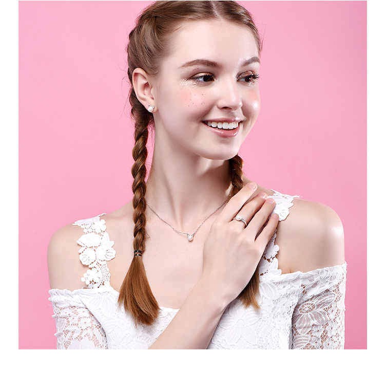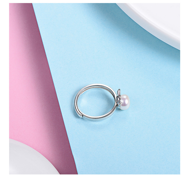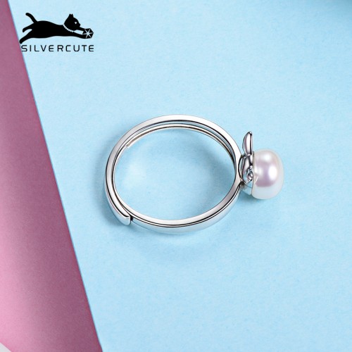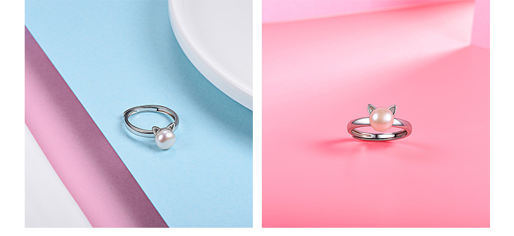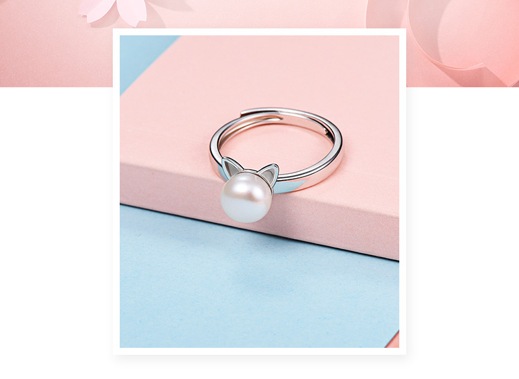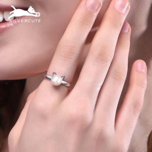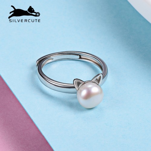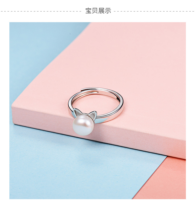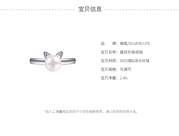 SILVERCUTE萌银 925银小猫咪戒指可爱耳朵淡水珍珠开口戒送女友