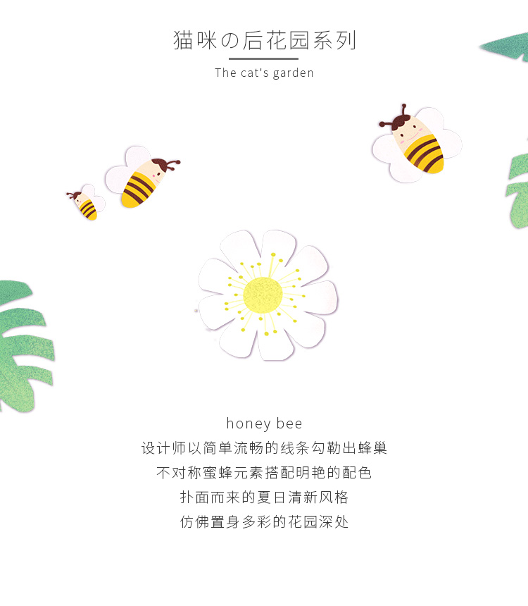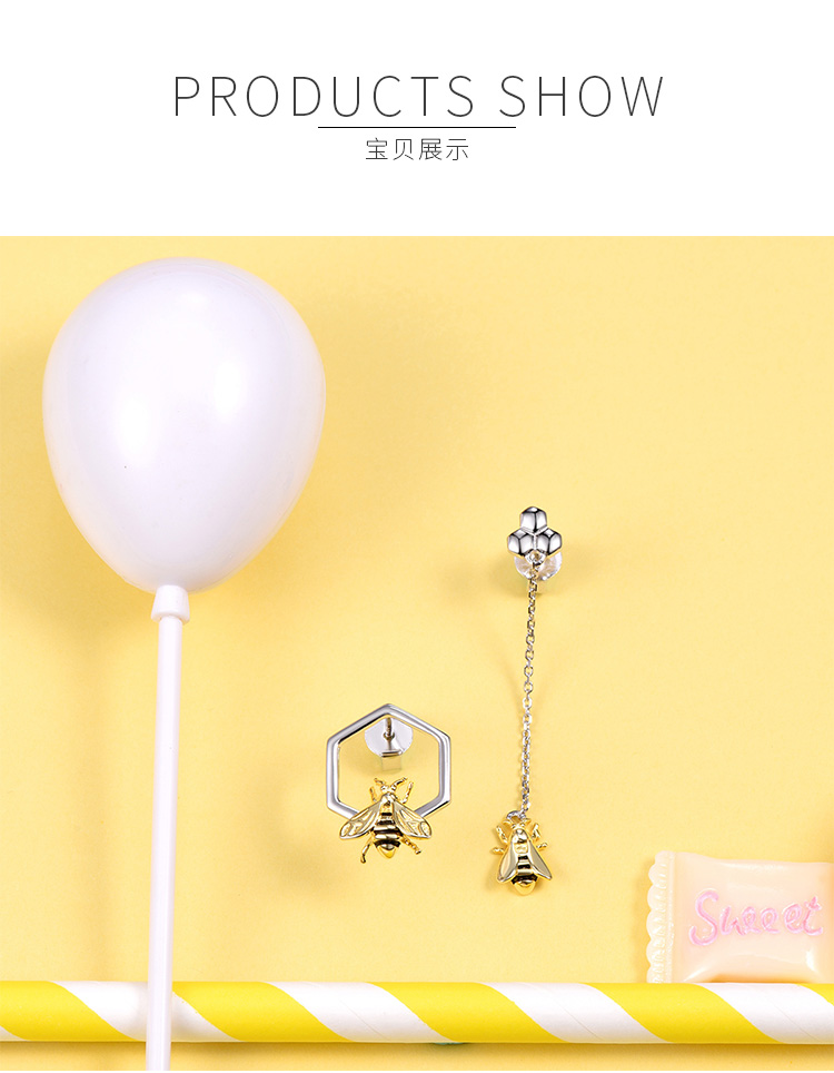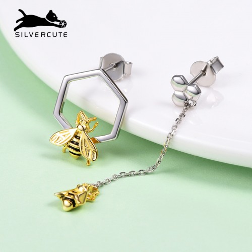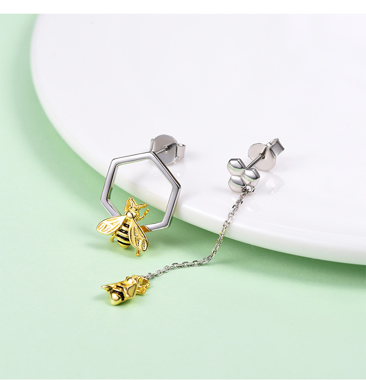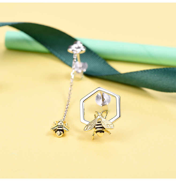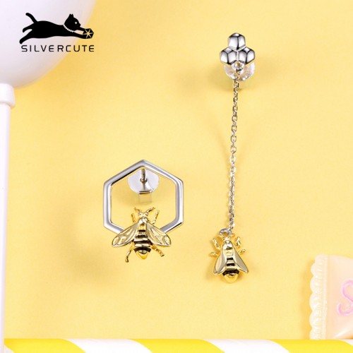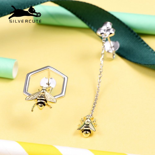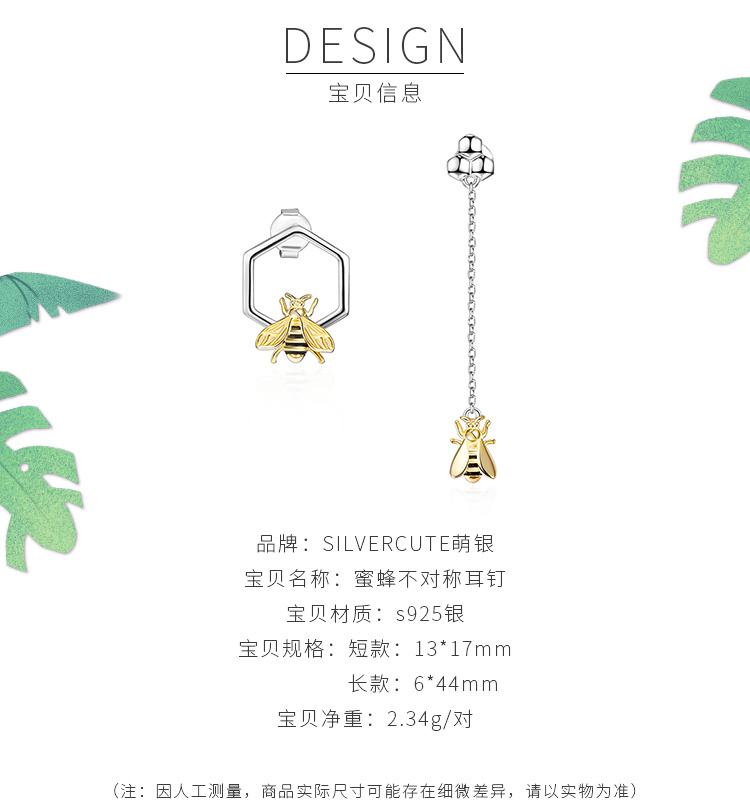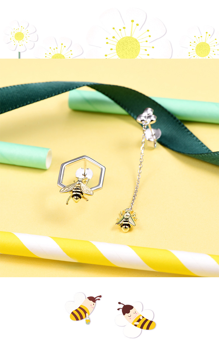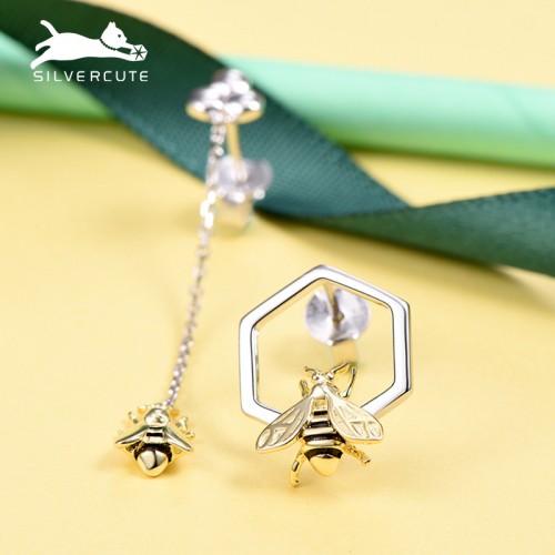 SILVERCUTE萌银 原创设计小蜜蜂不规则耳钉女不对称925银镀18K金耳饰
